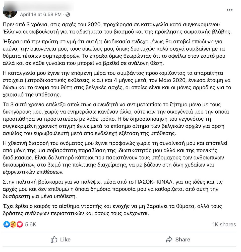Το στέλεχος του ΠΑΣΟΚ εξηγεί ότι κατήγγειλε τον ευρωβουλευτή του ΣΥΡΙΖΑ στις αρχές του 2020 για βιασμό και σωματική βλάβη. Μάλιστα, σημειώνει πως «η καταγγελία μου έγινε την επόμενη ημέρα του συμβάντος, προσκομίζοντας τα απαραίτητα στοιχεία (ιατροδικαστικές εκθέσεις κ.ά.), και 4 μήνες μετά, τον Μάιο 2020, ένιωσα έτοιμη να δώσω και το όνομα του θύτη στις βελγικές αρχές, οι οποίες είναι και οι μόνες αρμόδιες για τον χειρισμό της υπόθεσης».