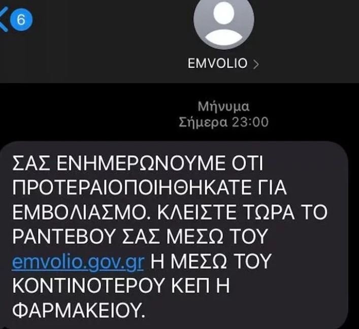 Το SMS που στέλνονται αναφέρουν: «Σας ενημερώνουμε ότι προτεραιοποιηθήκατε για εμβολιασμό. Κλείστε τώρα το ραντεβού σας μέσω του emvolio.gov.gr ή μέσω του κοντινότερου ΚΕΠ ή φαρμακείου».