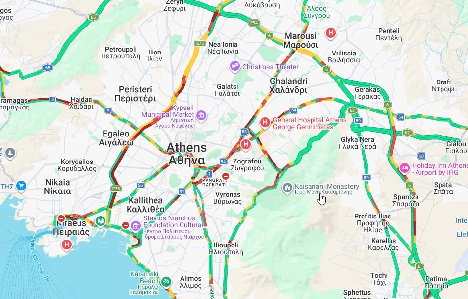 Η κατάσταση στους δρόμους της Αττικής είναι σήμερα περισσότερο από μποτιλιαρισμένη: μεγάλοι οδικοί άξονες σε όλο το λεκανοπέδιο λειτουργούν σε «κόκκινο» επίπεδο κυκλοφορίας, με σημαντικές καθυστερήσεις και εκτεταμένη συμφόρηση.