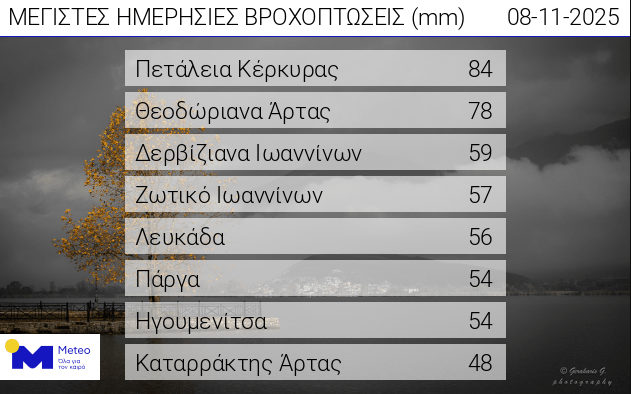 Αξιόλογα ύψη βροχής καταγράφηκαν κατά τόπους τις πρωινές ώρες του Σαββάτου 8 Νοεμβρίου 2025 στα δυτικά κυρίως σε τμήματα του Ιονίου και της Ηπείρου σύμφωνα με το meteo.