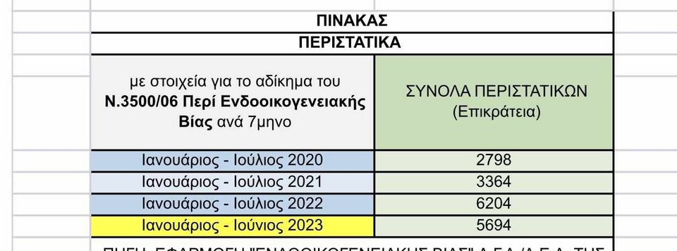 Σύμφωνα με τα επίσημα στοιχεία, τα περιστατικά ενδοοικογενειακής βίας στην επικράτεια, όπως θα δείτε και στον πίνακα που ακολουθεί, αυξήθηκαν ραγδαία, μετά την περίοδο της πανδημίας.