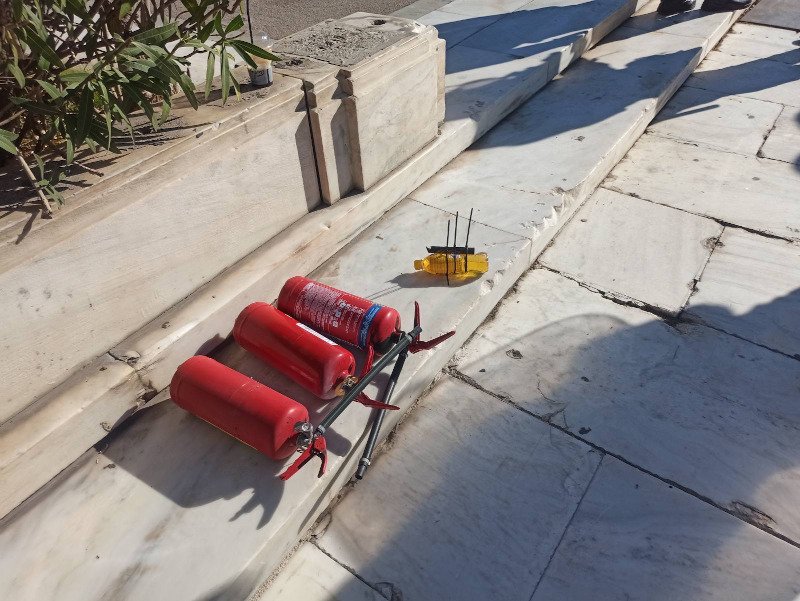 Οι αστυνομικοί εντόπισαν κρυμμένους πυροσβεστήρες, αλλά και μία σακούλα με μολότοφ σε παρτέρι στην Πανεπιστημίου.
