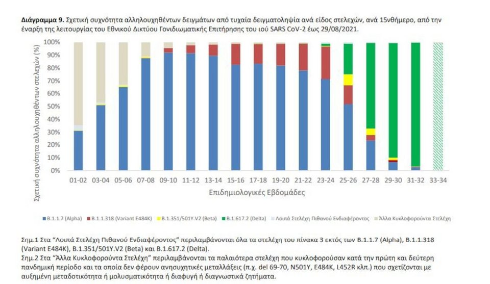 Η διαχρονική εξέλιξη της σχετικής συχνότητας των αλληλουχηθέντων δειγμάτων από τυχαία δειγματοληψία ανά είδος στελεχών, μέχρι και την εβδομάδα 32 απεικονίζεται στο Διάγραμμα 9, ενώ δίνονται επιπλέον προσωρινά στοιχεία για τις εβδομάδες 33-34.