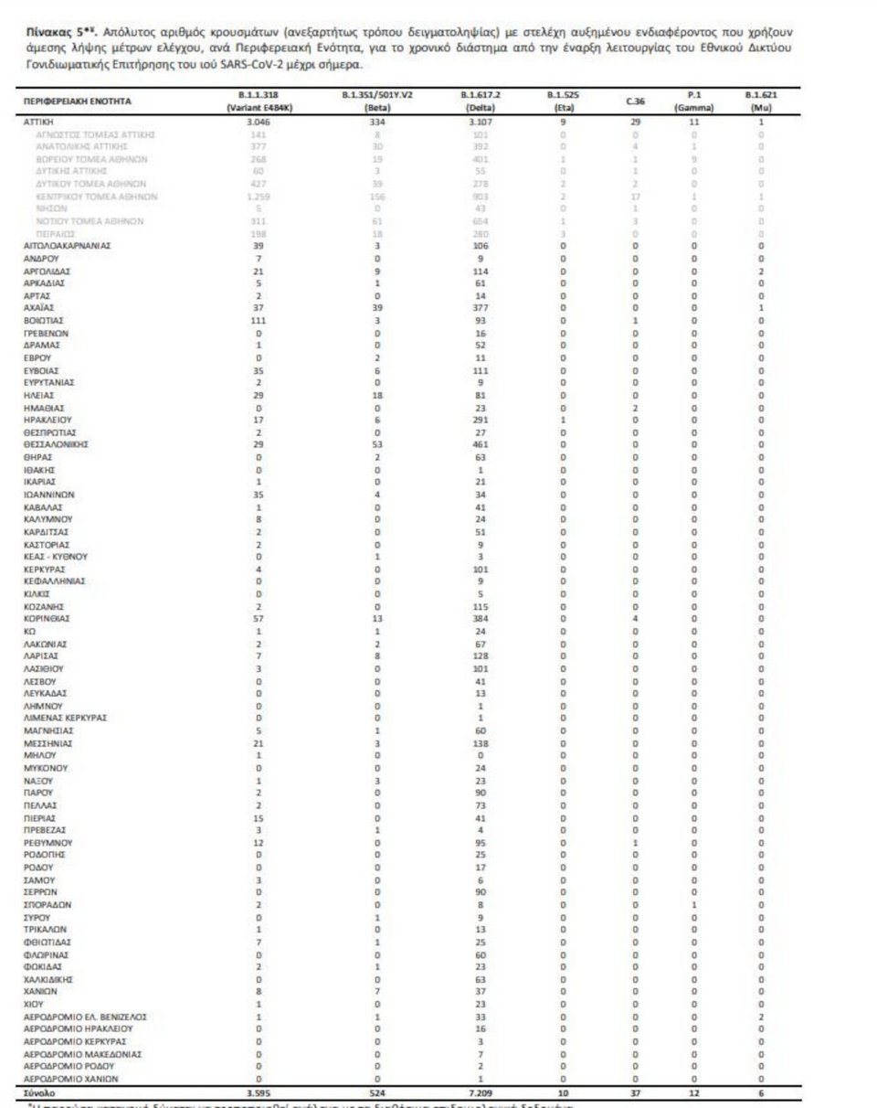 Από τα δείγματα αυτά, 43,44% αφορούν στο B.1.1.318 (Variant E484K), 28,48% στο Delta, 15,78% στο Alpha, 6,67% στο Beta, 0,13% στο C.36 και 0,10% στο Gamma.