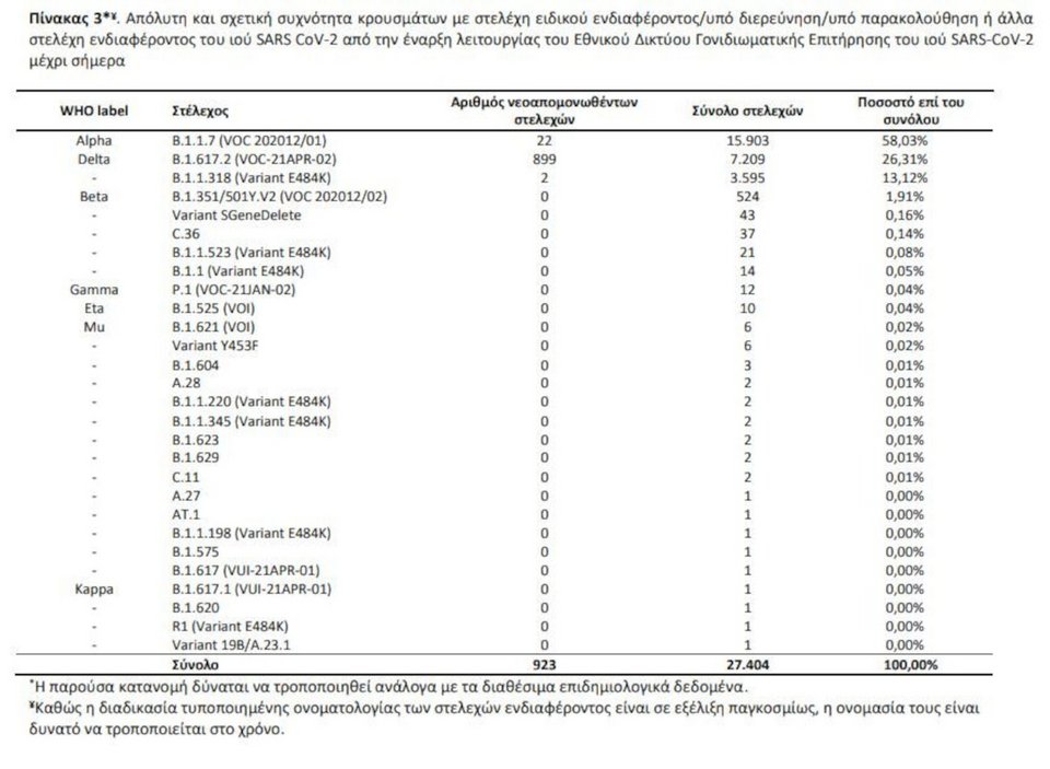 Εκ των 921 δειγμάτων με στελέχη ειδικού ενδιαφέροντος, τα 899 αφορούν στο στέλεχος Delta και 22 αφορούν στο Alpha.