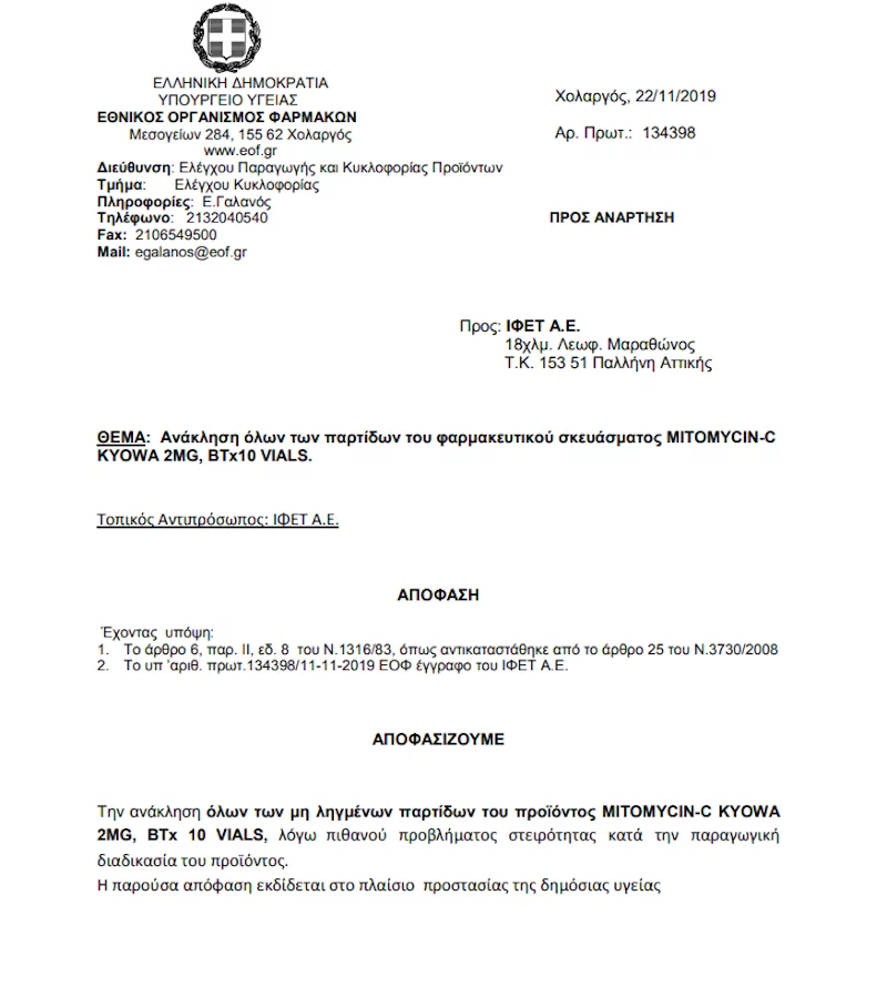 Η σχετική απόφαση του ΕΟΦ για το εν λόγω φάρμακο το οποίο πιθανότατα να μην αποστειρώθηκε σωστά κατά τη διαδικασία παραγωγής του, εκδίδεται στο πλαίσιο προστασίας της δημόσιας υγείας.