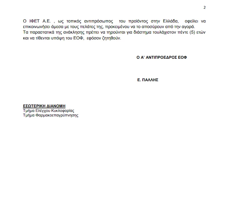 Ο ΙΦΕΤ A.E., ως τοπικός αντιπρόσωπος του προϊόντος στην Ελλάδα, οφείλει να επικοινωνήσει άμεσα με τους πελάτες, προκειμένου να το αποσύρουν από την αγορά. Τα παραστατικά της ανάκλησης πρέπει να τηρούνται για διάστημα τουλάχιστον πέντε (5) ετών και να τίθενται υπόψη του ΕΟΦ, εφόσον ζητηθούν. Η σχετική απόφαση του ΕΟΦ εκδίδεται στο πλαίσιο προστασίας της δημόσιας υγείας.