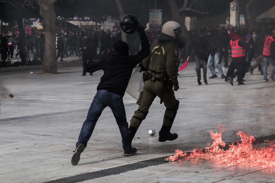 Μια μικρή ομάδα διαδηλωτών επιτέθηκε με βόμβες μολότοφ κατά των αστυνομικών, με τα ΜΑΤ να απαντούν με χρήση χημικών και χειροβομβίδων κρότου-λάμψης.