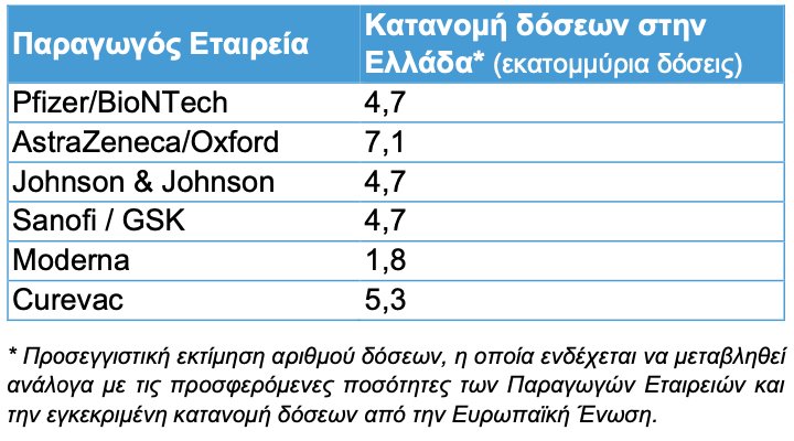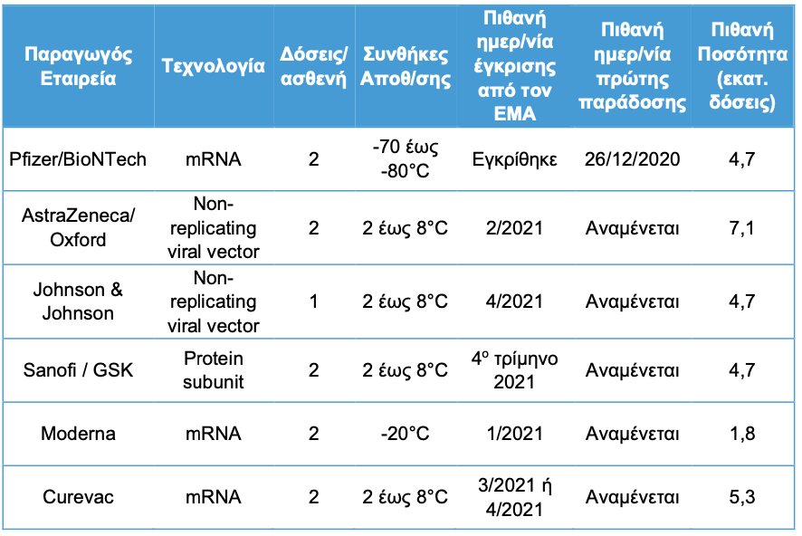 Η χώρα μας θα προμηθευτεί εμβόλια σταδιακά από έξι (6) τουλάχιστον παραγωγούς, ξεκινώντας με την πρώτη παραλαβή το Δεκέμβριο 2020 από την Pfizer/ BioNTech.