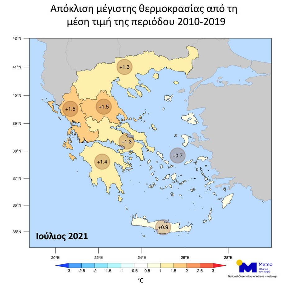 Σε όλα τα γεωγραφικά διαμερίσματα της χώρας οι μετεωρολογικοί σταθμοί του Εθνικού Αστεροσκοπείου Αθηνών/meteo.gr κατέγραψαν τιμές θερμοκρασίας πάνω από τον μέσο όρο της περιόδου 2010-2019 για τον μήνα Ιούλιο. Τα διαστήματα με θερμοκρασία ελαφρώς κάτω από τις κανονικές για την εποχή τιμές ήταν σύντομα, μεταξύ 3-5 και 18-25 Ιουλίου, ενώ δύο κύματα καύσωνα χαρακτήρισαν το υπόλοιπο του μήνα (κυρίως τις 2 πρώτες και 5 τελευταίες ημέρες). Στα νησιά του Αν. Αιγαίου, τις Κυκλάδες και τα Δωδεκάνησα ήταν ο πιο θερμός Ιούλιος της δεκαετίας, θερμότερος κατά 0,1°C από τον ακραίο μήνα του 2018. Στα ηπειρωτικά τμήματα και στην Κρήτη, ο φετινός Ιούλιος ήταν περίπου 1°C πιο ψυχρός από τον εξαιρετικά θερμό Ιούλιο του 2012. Ο χάρτης παρουσιάζει τις αποκλίσεις της μέγιστης ημερήσιας θερμοκρασίας σε 7 γεωγραφικά διαμερίσματα της Ελλάδας.