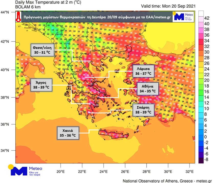 Στην Αθήνα αναμένονται θερμοκρασίες έως 34-35 βαθμούς, στα Χανιά 35-36, στη Λάρισα 36-37, ενώ στο Άργος και τη Σπάρτη 38-39 βαθμούς.