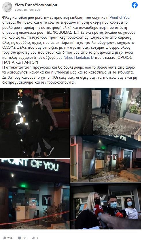 «Σε ένα κράτος δικαίου δεν χωρούν και κυρίως δεν πετυχαίνουν πρακτικές τρομοκρατίας! Ευχαριστώ από καρδιάς όλες τις αρμόδιες αρχές που με εκπληκτική ταχύτητα λειτούργησαν, ευχαριστώ όλους εσάς που μας στηρίζετε με την αγάπη σας, ευχαριστώ θερμά όλους τους συνεργάτες μου που στάθηκαν δίπλα μου από τα ξημερώματα μέχρι τώρα και τέλος ευχαριστώ τον σύζυγό μου που στέκεται όρθιος πάντα και παντού».