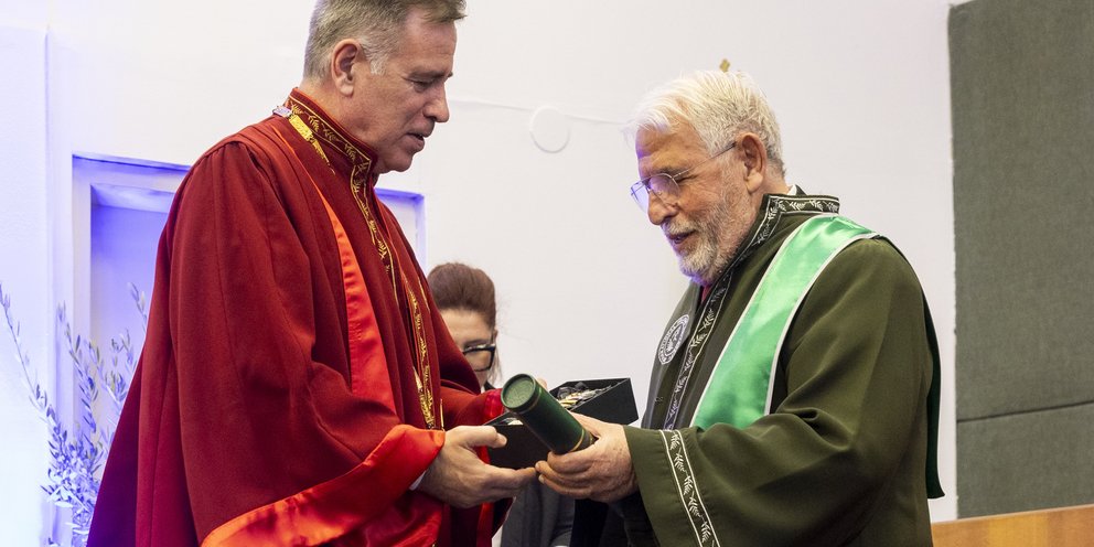 Η αναγόρευση του Τιμώμενου σε Επίτιμο Διδάκτορα, η περιένδυση και η επίδοση τιμητικής πλακέτας στον Δρ. Γεώργιο Β. Αποστολόπουλο, πραγματοποιήθηκε από τον Πρύτανη του Διεθνούς Πανεπιστημίου της Ελλάδος, Καθηγητή Σταμάτη Αγγελόπουλο.