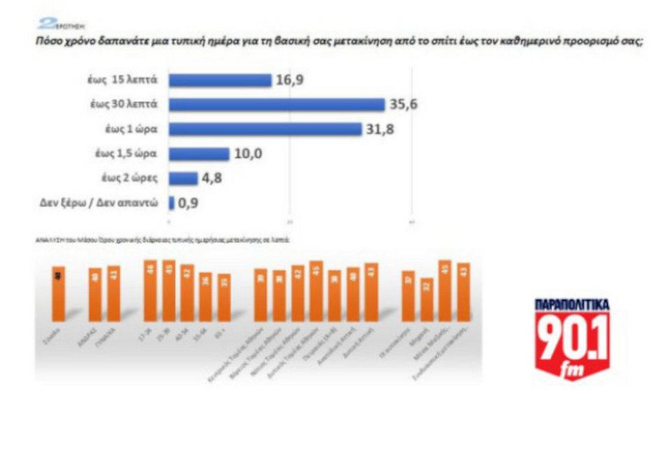 Οπως ανέφερε ο διευθυντής ερευνών της GPO Αντώνης Παπαργύρης που μίλησε στους Σωτήρη Ξενάκη και Βασίλη Σκουρή «το 15% των κατοίκων της Αττικής δαπανά πάνω από 1 ώρα για να μπορέσει να φτάσει στον προορισμό του».