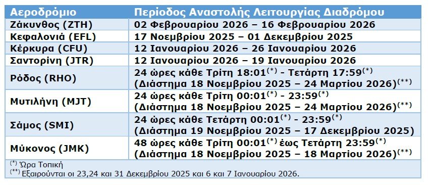 Συγκεκριμένα, οι ημερομηνίες για την αναστολή λειτουργίας των διαδρόμων, ανά αεροδρόμιο, παρουσιάζονται στον παρακάτω πίνακα: