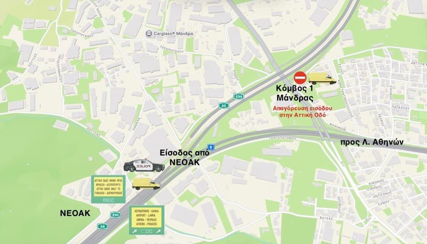 Από την τροχαία έχουν τεθεί σε ισχύ κυκλοφοριακές ρυθμίσεις με αποτέλεσμα τον ολικό αποκλεισμό σε συγκεκριμένα σημεία στην κατεύθυνση προς αεροδρόμιο στον Δήμο Μάνδρας- Ειδυλλίας, Ελευσίνας, Ασπροπύργου και Φυλής.