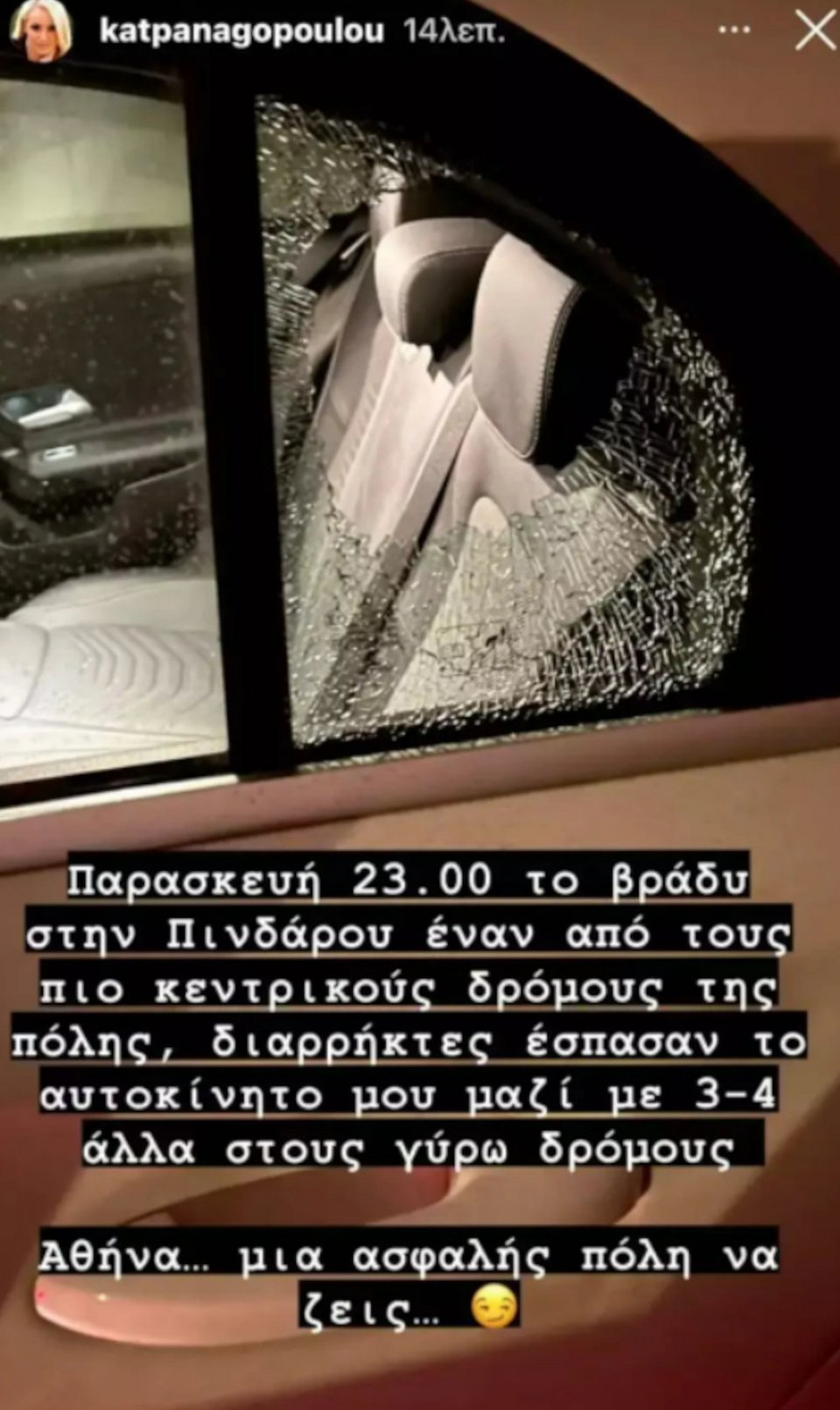 «Παρασκευή 23:00 το βράδυ στην Πινδάρου, έναν από τους πιο κεντρικούς δρόμους της πόλης, διαρρήκτες έσπασαν το αυτοκίνητό μου μαζί με 3-4 άλλα στους γύρω δρόμους… Αθήνα μια ασφαλής πόλη να ζεις» έγραψε η Κατερίνα Παναγοπούλου.