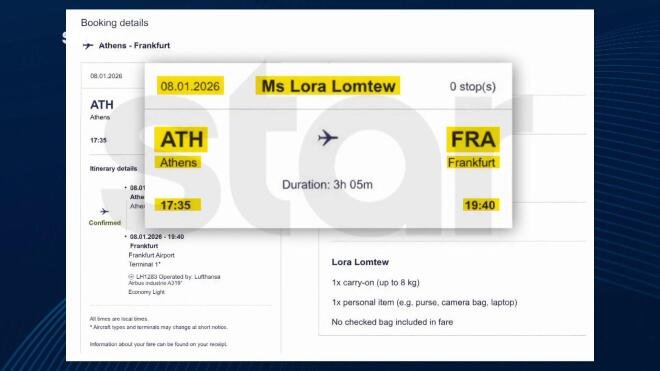 Το Star παρουσίασε φωτογραφία του αεροπορικού εισιτηρίου που φέρει το όνομα της ανήλικης, το οποίο αποκαλύπτει ότι η πτήση αναχώρησε από το «Ελευθέριος Βενιζέλος» για Φρανκφούρτη, στις 17:35 το απόγευμα της 8ης Ιανουαρίου. Ωστόσο, αν και το εισιτήριο είναι υπαρκτό, δεν έχει επιβεβαιωθεί επίσημα εάν η Λόρα επιβιβάστηκε στο αεροπλάνο, γεγονός που συνεχίζει να τροφοδοτεί το μυστήριο γύρω από την εξαφάνισή της.