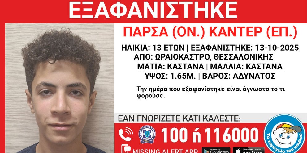 Συναγερμός σήμανε στις Αρχές της Θεσσαλονίκης λόγω εξαφάνισης ενός 13χρονου από χώρο φιλοξενίας στο Ωραιόκαστρο.