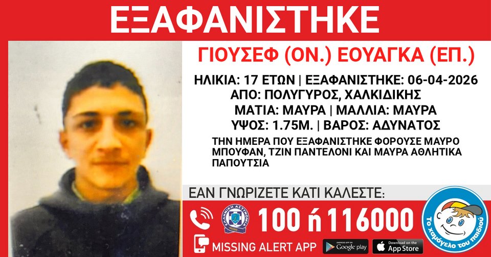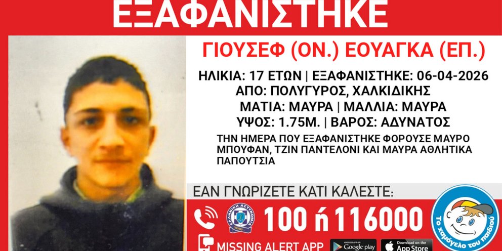 Σύμφωνα με το Χαμόγελο του Παιδιού, ο ανήλικος αγνοείται από σήμερα Δευτέρα και προχώρησε άμεσα σε δημοσιοποίηση των στοιχείων του, κατόπιν εισαγγελικής εντολής, καθώς ενδέχεται να συντρέχουν λόγοι οι οποίοι θέτουν την ζωή του σε κίνδυνο.