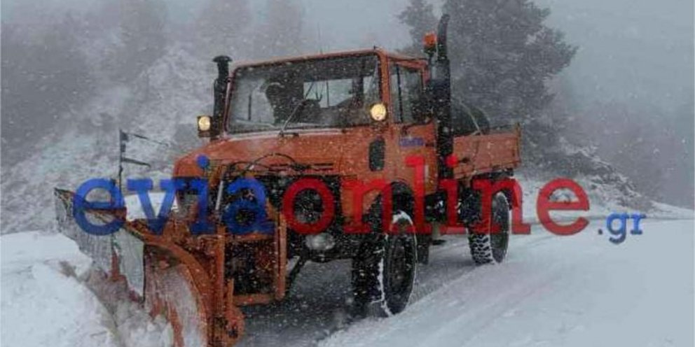 Μηχανήματα της περιφέρειας Στερεάς Ελλάδας και του Δήμου Διρφύων Μεσσαπίων βρίσκονται συνέχεια στους δρόμους και τους καθαρίζουν από το πυκνό χιόνι που πέφτει ασταμάτητα.