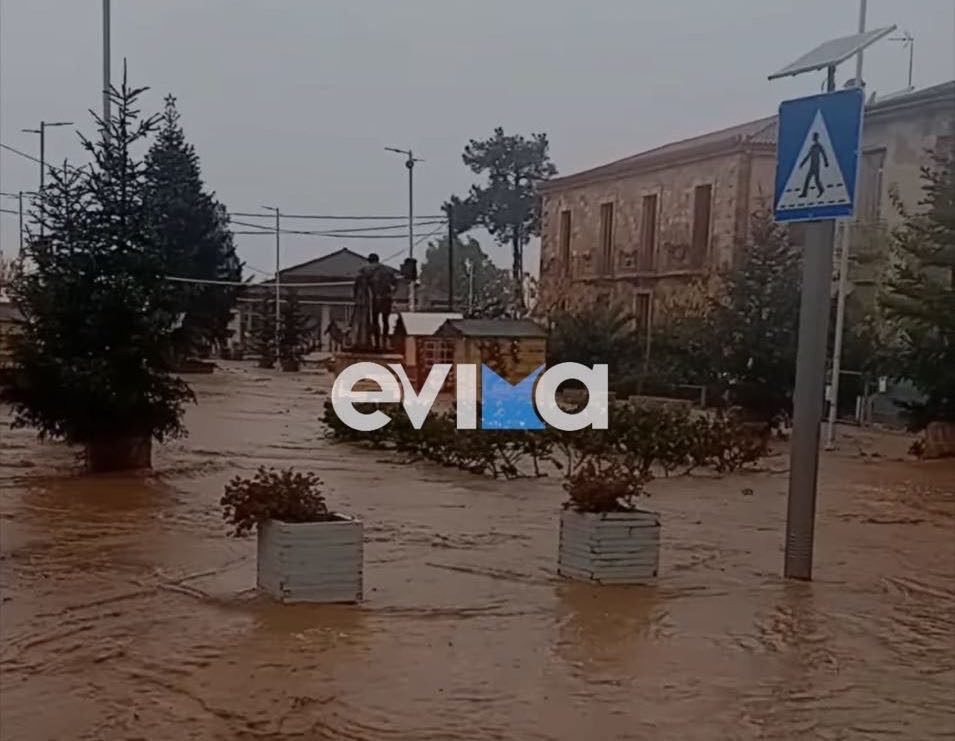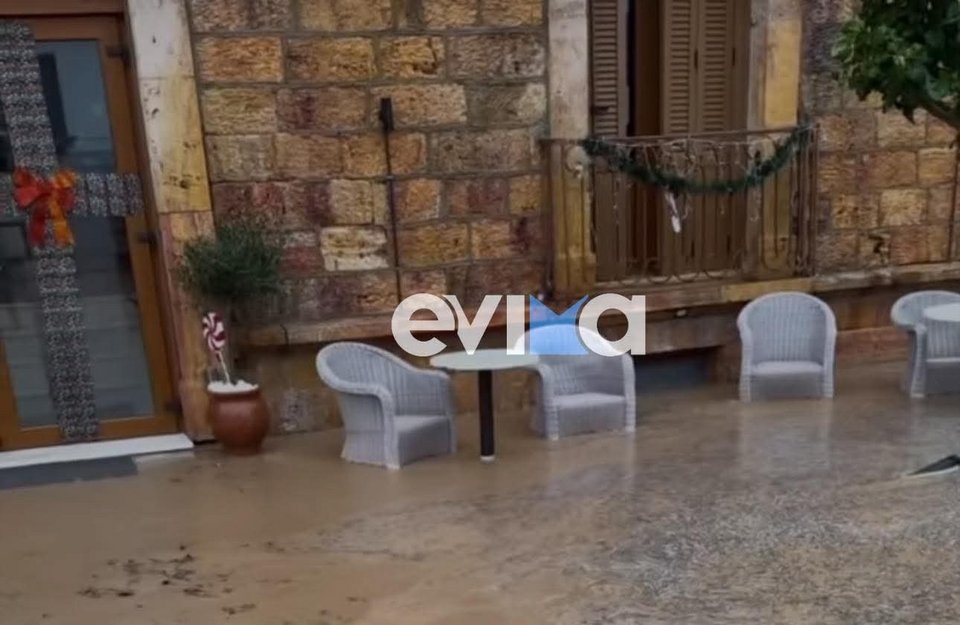 Δρόμοι μετατράπηκαν σε λίμνες από την έντονη βροχόπτωση στα Λουτρά Αιδηψού, στην Εύβοια.