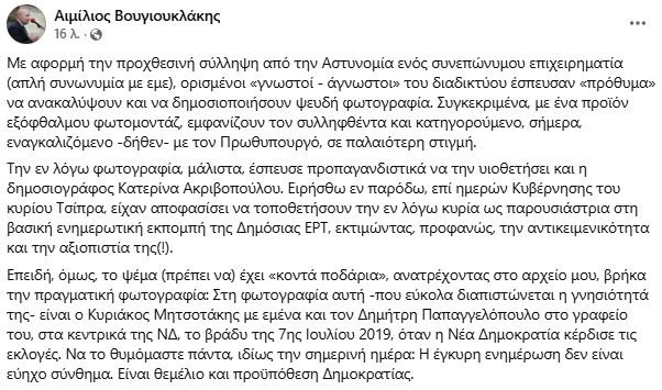 Η ανάρτηση του Αιμίλιου Βουγιουκλάκη για την fake φωτογραφία του Κυριάκου Μητσοτάκη με τον απατεώνα επιχειρηματία