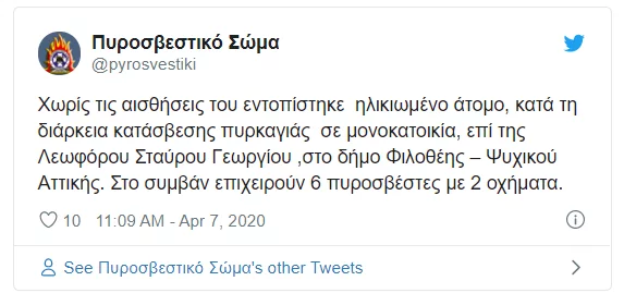 Σύμφωνα με το Πυροσβεστικό Σώμα στο συμβάν επιχείρησαν συνολικά έξι πυροσβέστες με δύο οχήματα. Η ενημέρωση του Π.Σ. στο twitter: