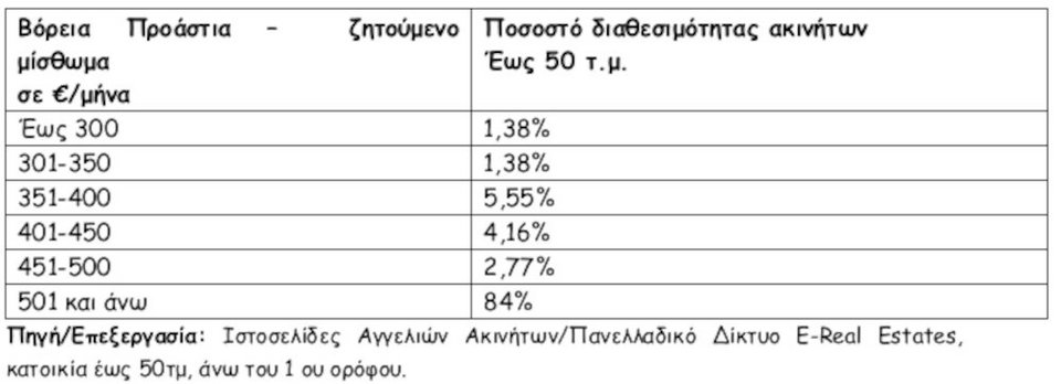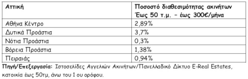 Στις περιοχές των Νοτίων Προαστίων η διαθεσιμότητα φοιτητικών κατοικιών με ζητούμενο μίσθωμα έως 300€ είναι μηδενική (0,3%), ενώ στον Πειραιά 0,94%.