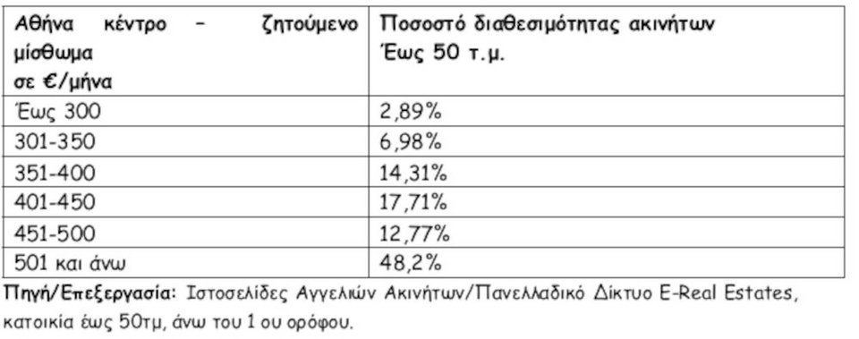 Συγκεκριμένα, στις περιοχές του κέντρου των Αθηνών, οι κατοικίες άνω του 1ου ορόφου έως 50τμ που διατίθενται με ζητούμενο μίσθωμα έως 300€ αποτελούν μόλις το 2,89% (12,47% το 2022) επί του συνόλου των διαθέσιμων προς μίσθωση κατοικιών άνω του 1ου ορόφου έως 50τμ.