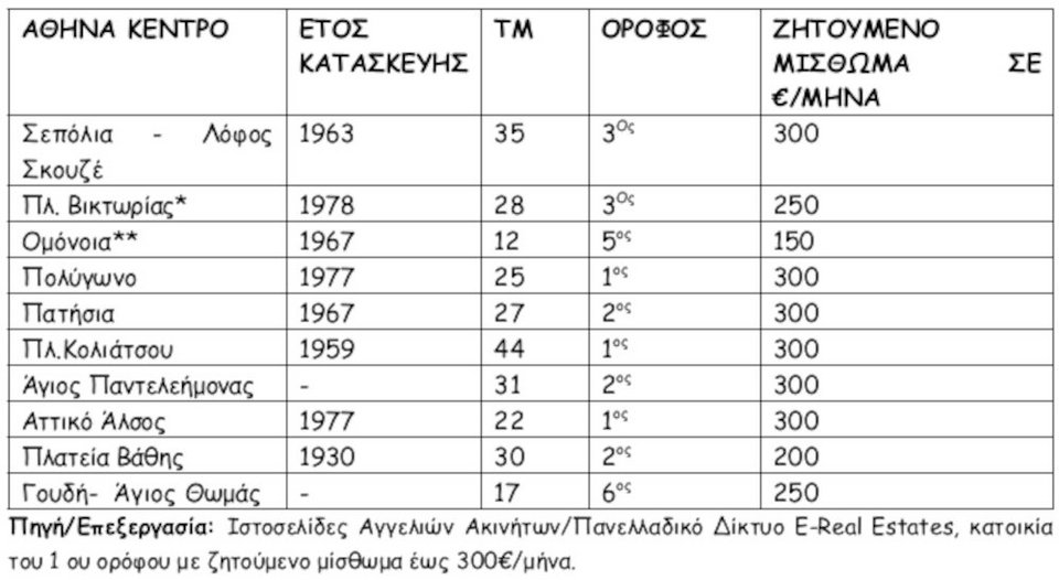 Παραδείγματα κατοικιών με ζητούμενο μίσθωμα έως 300€/μήνα στις περιοχές του κέντρου της Αθήνας.