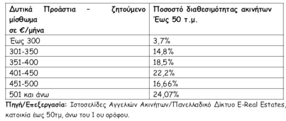 Παρόμοια εικόνα καταγράφεται και στις περιοχές των Δυτικών Προαστίων, όπου μόλις το 3,7% των κατοικιών άνω του 1ου ορόφου έως 50τμ διατίθενται με μίσθωμα έως 300€ τη φετινή χρονιά, έναντι του 14,29% πέρυσι.