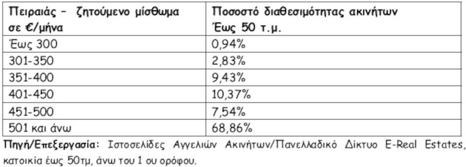 Στον Πειραιά η διαθεσιμότητα κατοικίας με ζητούμενο μίσθωμα έως 300€ είναι μηδενική. Οι κατοικίες 21-τμ-30τμ με ζητούμενο μίσθωμα έως 350€/μήνα την περίοδο Ιουνίου-Ιουλίου, πλέον, έχουν μισθωθεί. Τη φετινή χρονιά, 1 στις 10 κατοικίες, έχουν ζητούμενο μίσθωμα από 401€ έως 450€. Η μόνη διαθεσιμότητα καταγράφεται στα υψηλότερα ζητούμενα μισθώματα.