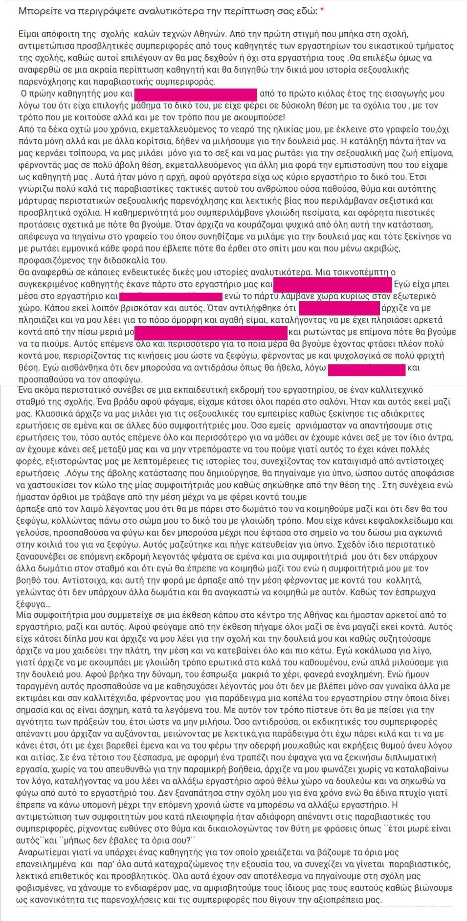 Σοκάρουν οι καταγγελίες για σεξουαλική παρενόχληση δύο φοιτητριών από καθηγητή της Ανώτατης Σχολής Καλών Τεχνών.