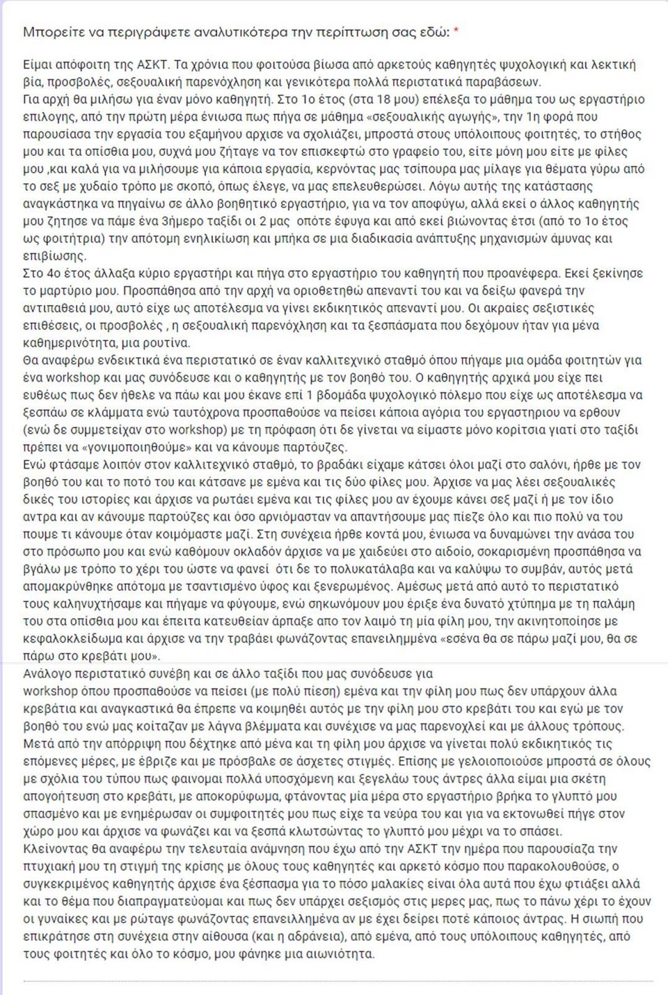 Οι δύο καταγγελίες αφορούν τον ίδιο καθηγητή, ο οποίος προσπάθησε επανειλημμένα να στρέψει την προσοχή σε ζητήματα σεξουαλικά, προσκαλούσε φοιτήτριες στο γραφείο του, κερνούσε τσίπουρα και προσπαθούσε να τους αποσπάσει πληροφορίες για την σεξουαλική τους ζωή. Μάλιστα σε εκδρομές της ΑΣΚΤ, παρενόχλησε τη μια κοπέλα φέρνοντας το κορμί του πάνω της και λέγοντάς της πως θα κοιμηθεί μαζί του, ενώ σε άλλη εκδρομή θώπευσε στα γεννητικά της όργανα την δεύτερη φοιτήτρια.