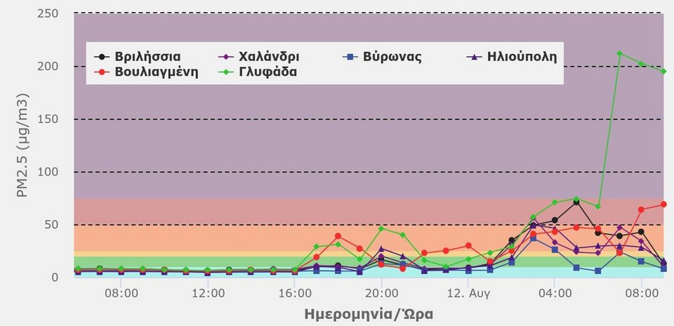 Σε συνέχεια της ολονύκτιας παρακολούθησης και ενημερώσεων του Εθνικού Αστεροσκοπείου Αθηνών για τις επικρατούσες συνθήκες και την ταχύτατη εξάπλωσης της πυρκαγιάς προς τα νότια υπό την επικράτηση ισχυρών βορείων ανέμων, η οποία από τα ξημερώματα της 12ης Αυγούστου προσέγγισε τις περιοχές Νέας και Παλαιάς Πεντέλης, η εικόνα των μέσων ωριαίων επιπέδων των αιωρούμενων σωματιδίων PM2.5, στην ατμόσφαιρα της Αττικής, μέχρι στιγμής, έχει ως ακολούθως: