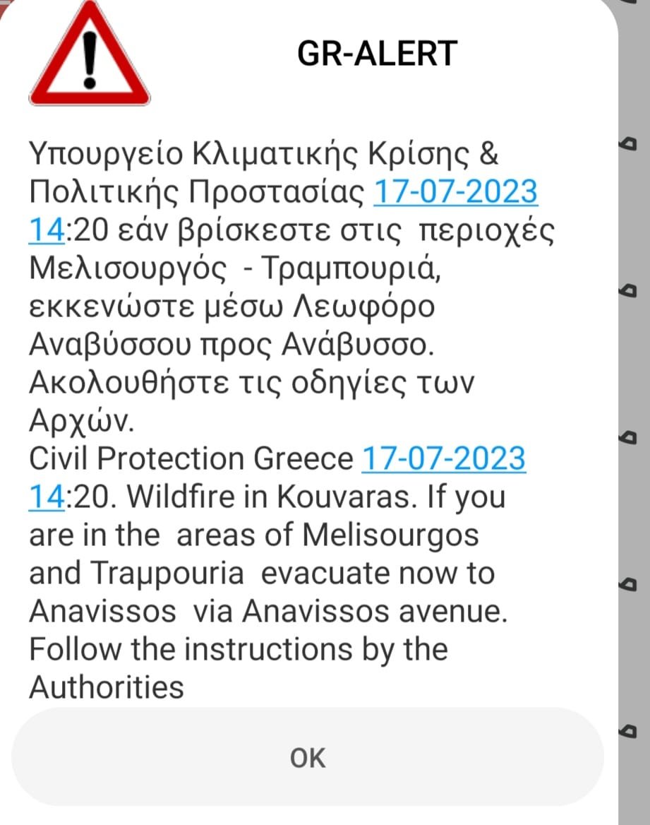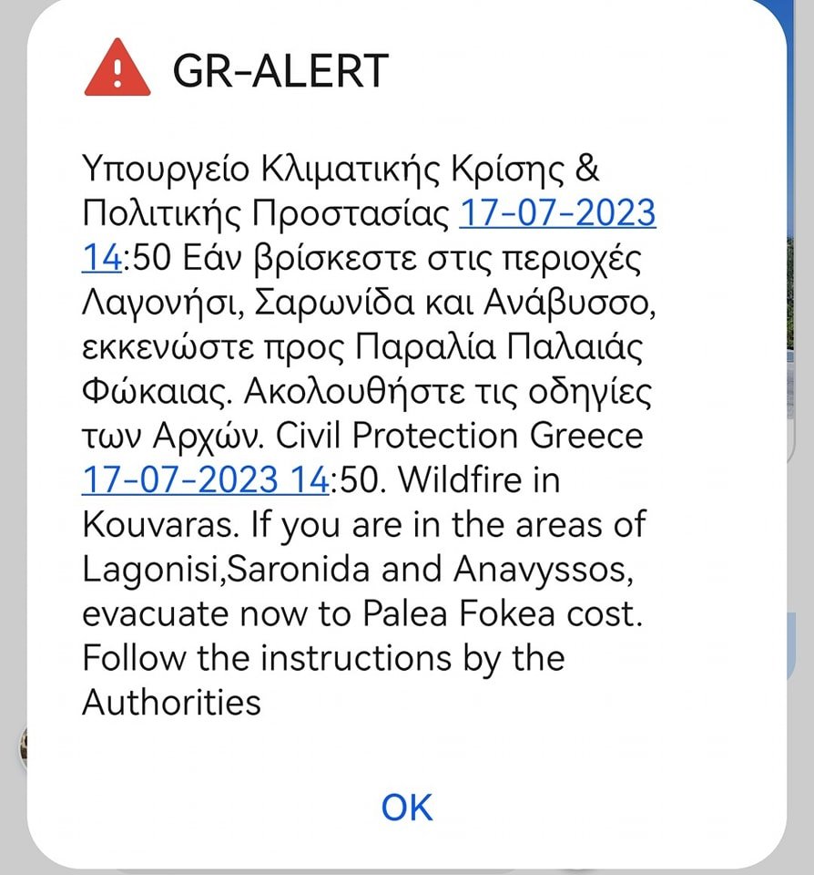 «Αν βρίσκεστε στην περιοχή Λαγονήσι, εκκενώστε προς Αθήνα», γράφει το μήνυμα.