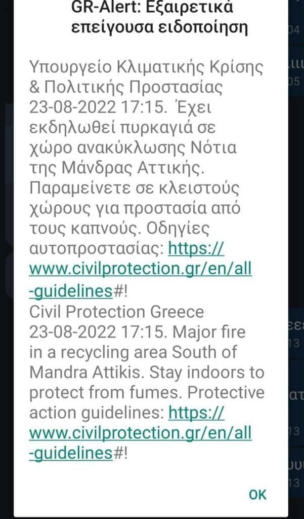 Το μήνυμα του 112 καλεί τους κατοίκους της περιοχής να παραμείνουν σε κλειστούς χώρους για να προστατευθούν από τους καπνούς εξαιτίας της φωτιάς στο εργοστάσιο «Κιτσολάμπρος».