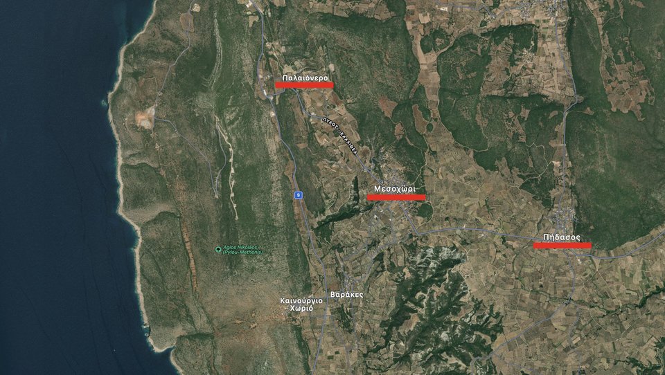 Σύμφωνα με το χάρτη, το Μεσοχώρι βρίσκεται νότια του Παλαιόνερου, όπου έχει ξεσπάσει η πυρκαγιά, και κάτοικοι και επισκέπτες καλούνται να εκκενώσουν προς τα ανατολικά, προς το χωριό Πήδασος.