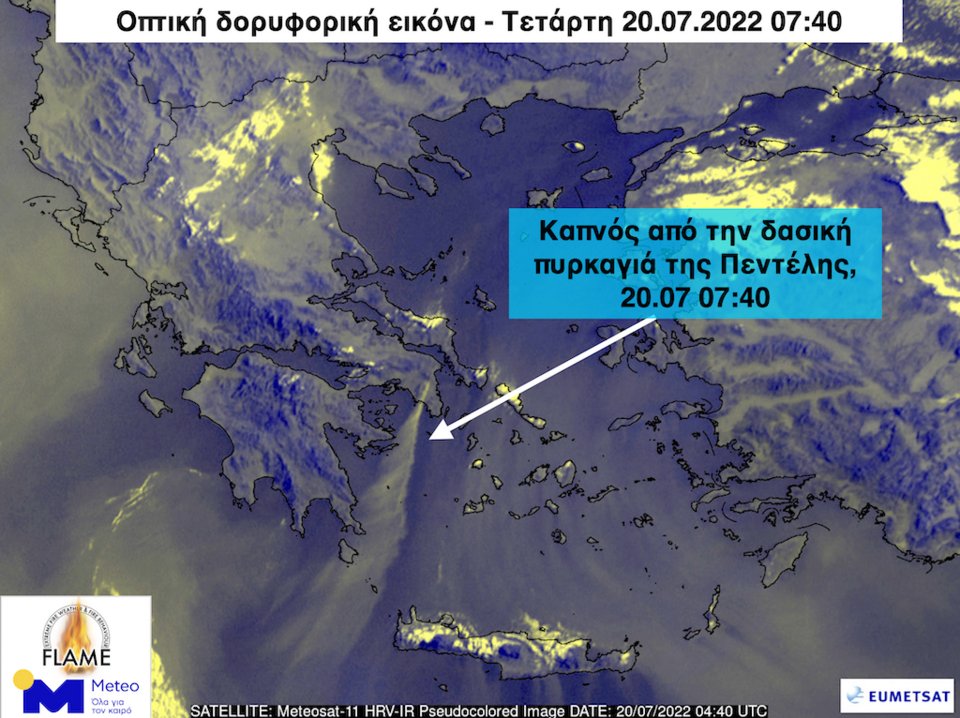 Συγκεκριμένα το άρθρο αναφέρει «οπτική δορυφορική εικόνα που λάβαμε και επεξεργαστήκαμε στο Εθνικό Αστεροσκοπείο Αθηνών/meteo.gr από τον Ευρωπαϊκό δορυφόρο METEOSAT-11, δείχνει τον καπνό της δασικής πυρκαγιάς της Πεντέλης να έχει μεταφερθεί από τους ισχυρούς βόρειους-βορειοανατολικούς ανέμους τουλάχιστον 400 χιλιόμετρα νότια-νοτιοδυτικά προς την θάλασσα των Κυθήρων και το Νοτιοδυτικό Κρητικό Πέλαγος το πρωί της Τετάρτης 20.07.2022 07:40».