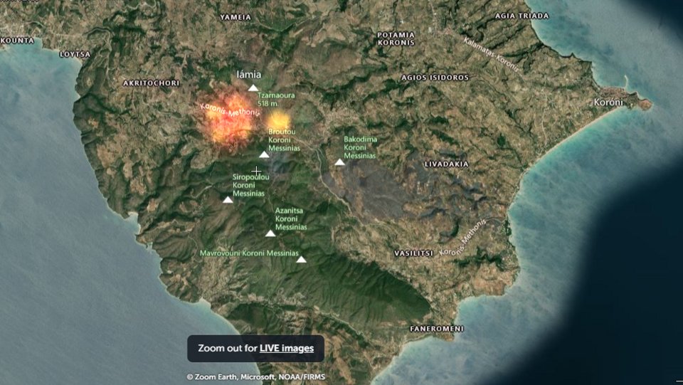 Τα μέτωπα της φωτιάς, φαίνεται πως είναι δύο. Η πυρκαγιά είναι γειτονική με την περιοχή που είχε καεί πέρυσι, όπως διακρίνονται από το δορυφόρο, τα καμένα σε Βασιλίτσι Κορώνης και Λιβαδάκια.