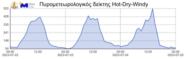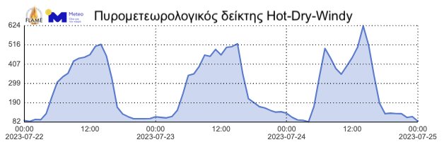 Τέλος, με βάση τα πιο πρόσφατα προγνωστικά στοιχεία της Πυρομετεωρολογικής Ομάδας FLAME του ΜΕΤΕΟ/ΕΑΑ (Εικόνες 3, 4), αναμένεται πρόσκαιρη και μερική βελτίωση των πυρομετεωρολογικών συνθηκών λόγω της σχετικής εξασθένησης των ανέμων. Θα πρέπει ωστόσο να σημειωθεί πως η ευφλεκτότητα των νεκρών δασικών καυσίμων θα παραμείνει ιδιαίτερα υψηλή και κατά τη διάρκεια των νυχτερινών ωρών (τιμές περιεχόμενης υγρασίας κάτω του 9-10%), γεγονός που αναμένεται να δυσχεράνει τον έλεγχο της φωτιάς. Σημαντικό είναι να τονιστεί ότι από τις πρώτες πρωινές ώρες εώς τις μεσημβρινές ώρες της Κυριακής 23.07.2023, στο δυτικό μέτωπο της πυρκαγιάς αναμένεται πρόσκαιρη μεταβολή της διεύθυνσης του ανέμου σε Β/ΒΑ, ενώ μετά τις μεσημβρινές ώρες αναμένουμε εκ νέου στροφή των ανέμων σε Β/ΒΔ διευθύνσεις. Οι πλέον δυσμενείς πυρομετεωρολογικές συνθήκες αναμένονται κατά τις θερμές ώρες (11:00 - 18:00) της Κυριακής 23.07.2023, οπότε και η ένταση των ανέμων θα αυξηθεί με την ευφλεκτότητα να είναι εξαιρετικά υψηλή (τιμές περιεχόμενης υγρασίας κάτω του 7%).
