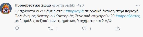 Όπως αναφέρεται και στην ανάρτηση του Πυροσβεστικού Σώματος στο Twitter, η πυρκαγιά είναι σε δασική έκταση στην περιοχή Πολυάνεμος Νεστορίου Καστοριάς.
