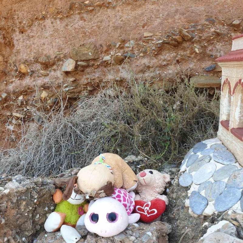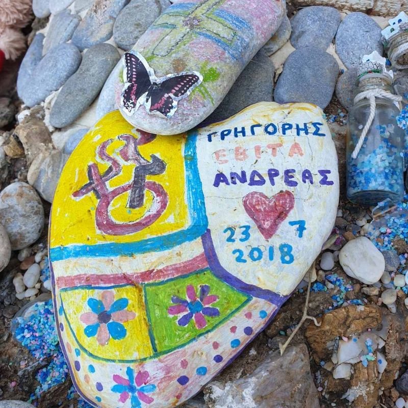 Το σημείο που η μικρή Εβίτα Φύτρου βούτηξε στο κενό κυνηγημένη από τις φλόγες, στις οποίες έχασε τον πατέρα και τον αδερφό της. Τρία κεριά σιγοκαίνε μπροστά στο βότσαλο με τα ονόματά τους Γρηγόρης, Εβίτα, Αντρέας και την ημερομηνία, ενώ παιχνίδια και αρκουδάκια είναι σκορπισμένα στα βράχια.
