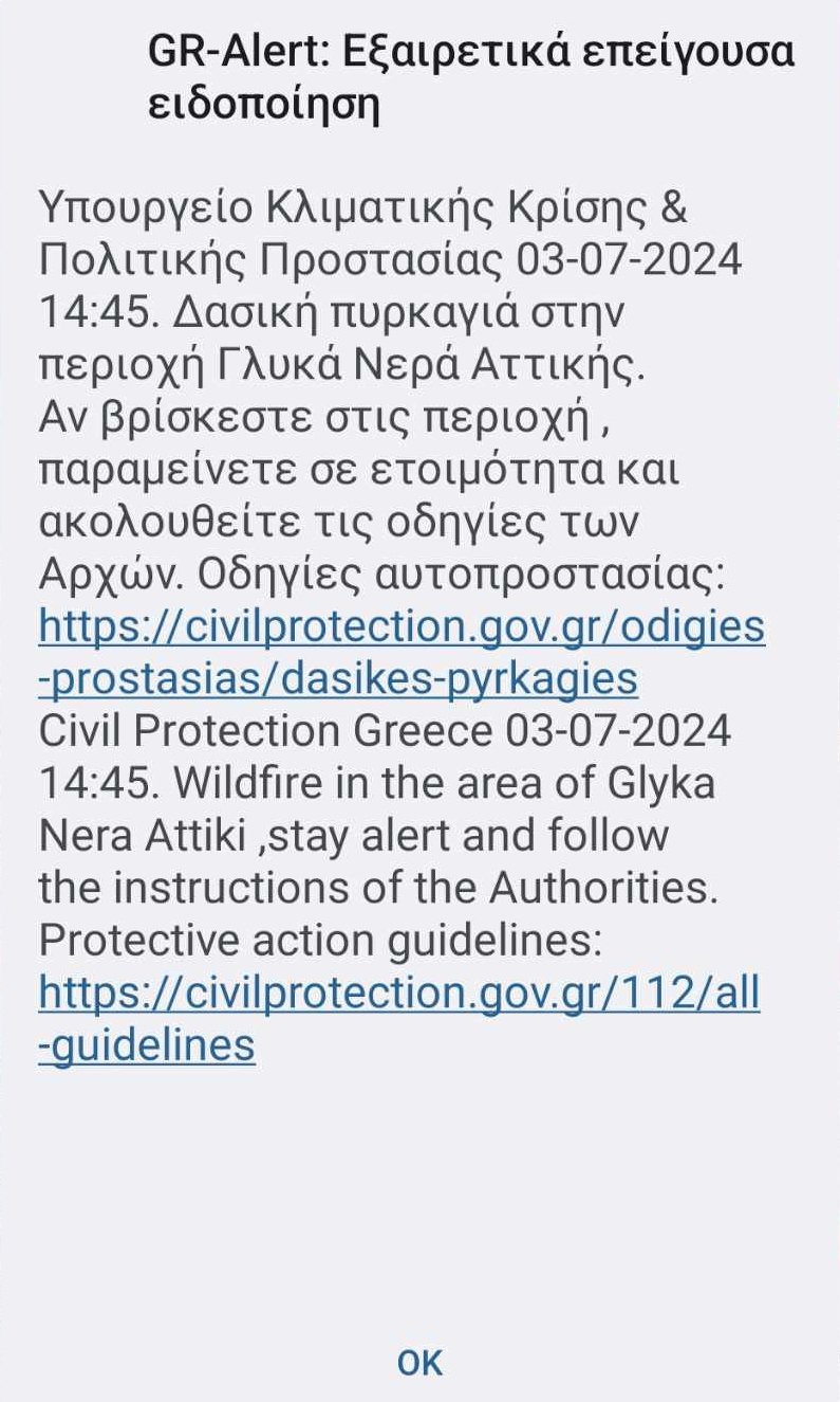 Όπως αναφέρει το μήνυμα: «Αν βρίσκεστε στην περιοχή Γλυκά Νερά Αττικής, παραμείνετε σε ετοιμότητα και ακολουθείτε τις οδηγίες των Αρχών».