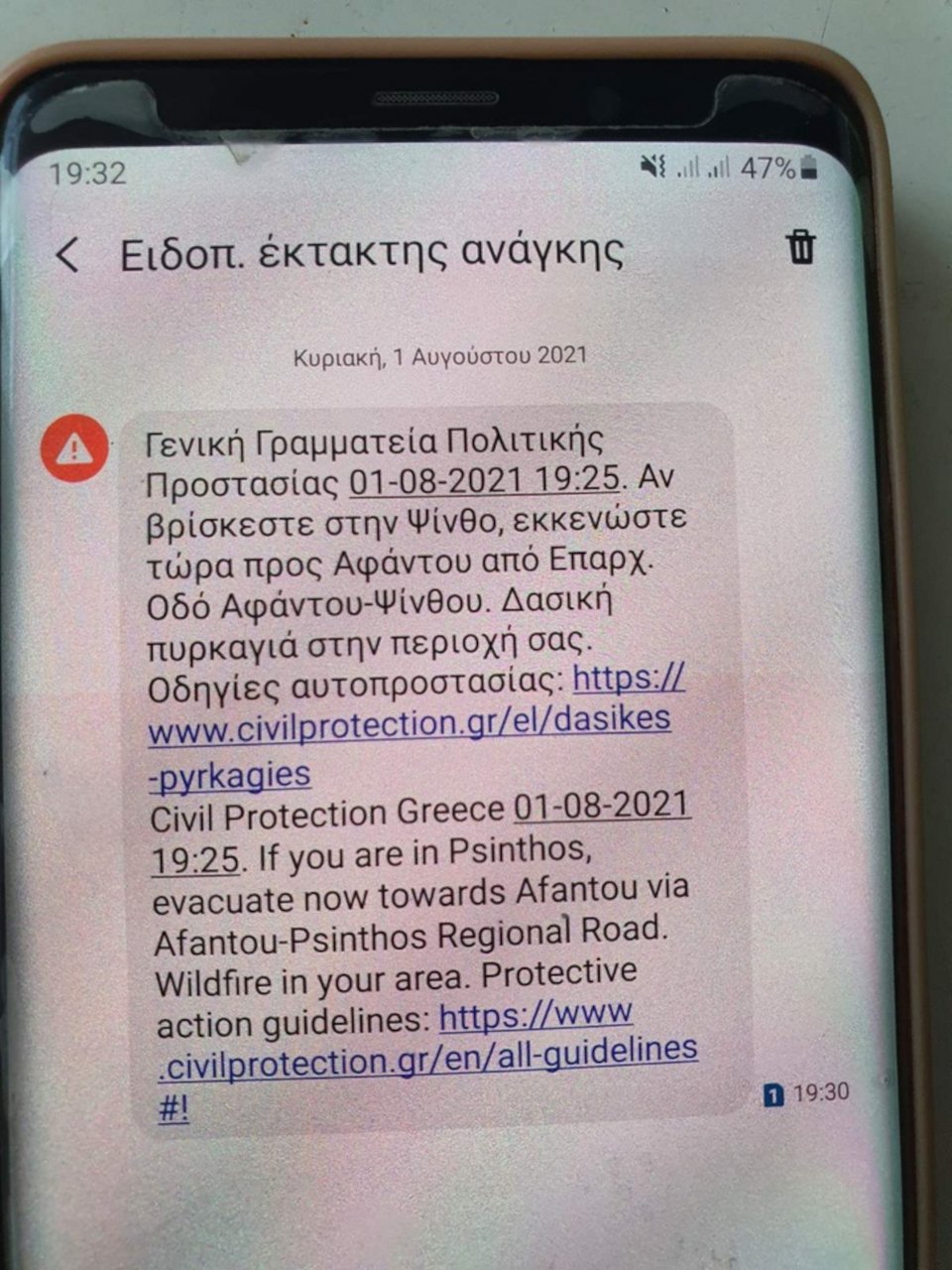 Λίγο μετά τις 19:30, όσοι βρίσκονται στην περιοχή Ψίνθο έλαβαν μήνυμα μέσω του 112 να απομακρυνθούν άμεσα από την περιοχή.