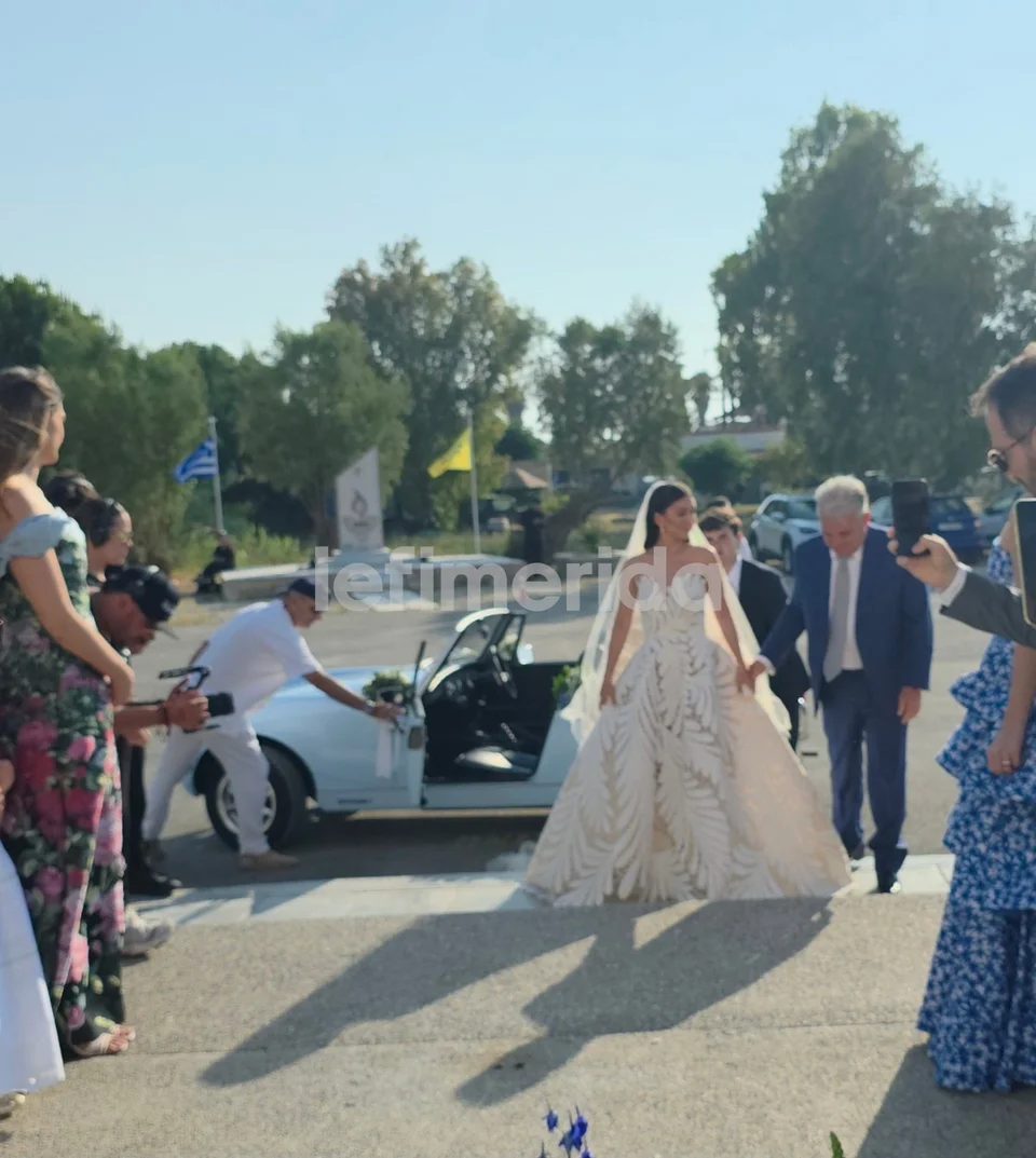 Η νύφη έφτασε στην εκκλησία με ένα ξεχωριστό vintage αυτοκίνητο, συνοδευόμενη από τον πατέρα της, Στέφανο Κουλουθρό, απαστράπτουσα μέσα στο δαντελένιο νυφικό με ασορτί πέπλο του οίκου Oscar de la Renta. Aκολουθούσε η μητέρα της, Αντριάνα, συνοδευόμενη από τον γιο της, Στέφανο jr. Συγκινημένη έφτασε στην εκκλησία και η μητέρα του γαμπρού, Λίτσα Κωνσταντίνου, συνοδευόμενη από τις τέσσερις κόρες της. Ο γάμος τελέστηκε από τον μητροπολίτη Μεξικού Ιάκωβο και ιερείς του Ναού του Αγίου Γεωργίου στην Κω.