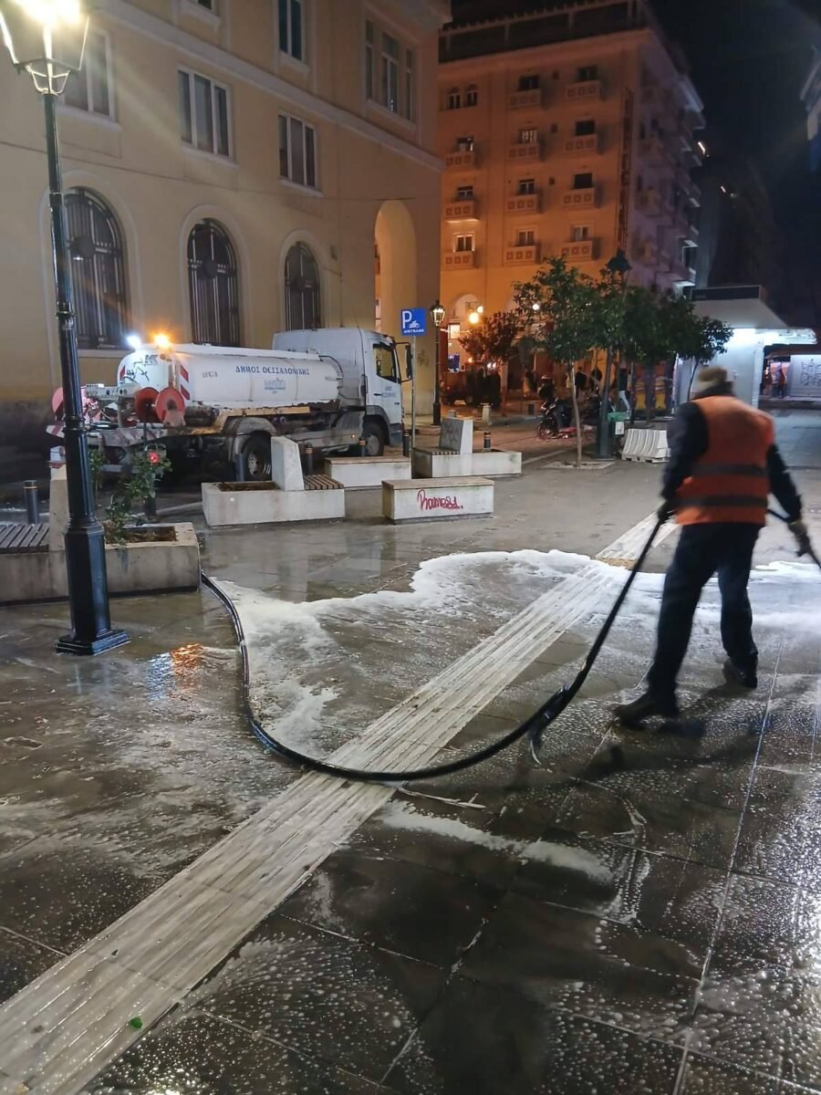 Στους δρόμους βγήκαν από τα ξημερώματα συνεργεία του δήμου Θεσσαλονίκης, προκειμένου να καθαρίσουν την πόλη μετά τα πάρτι της Τσικνοπέμπτης.