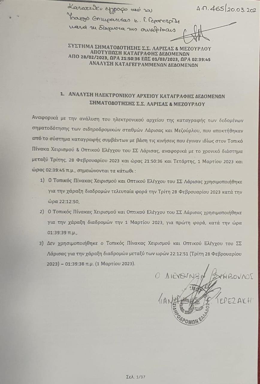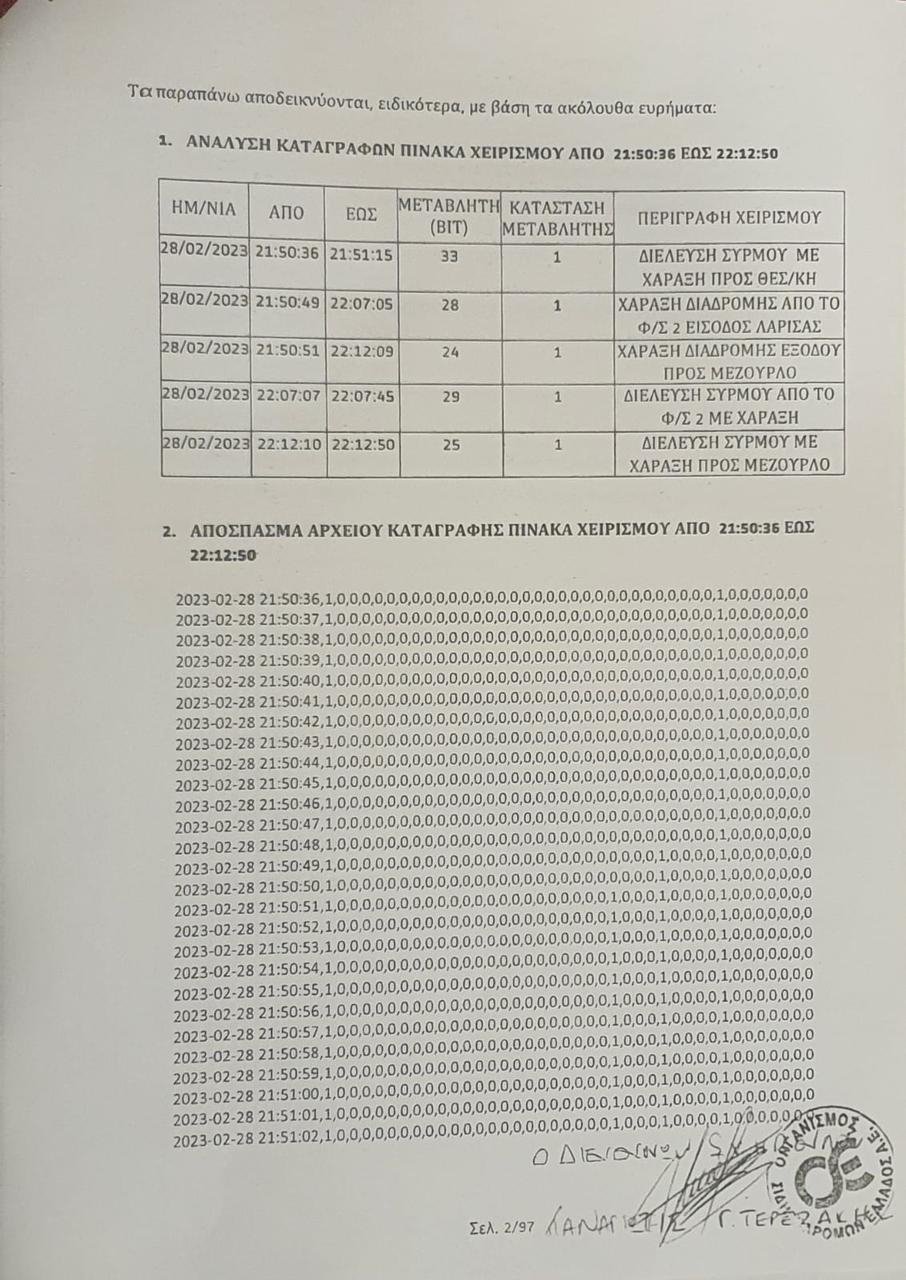 Οπως προκύπτει από την ανάλυση ηλεκτρονικού αρχείου καταγραφής δεδομένων σηματοδότησης ΣΣ Λάρισας και Μεζούρλου που αποκτήθηκαν από το σύστημα καταγραφής συμβάντων με βάση τις κινήσεις που έγιναν ιδίως στον Τοπικό Πίνακα Χειρισμού και Οπτικού ελέγχου του ΣΣ Λάρισας, αναφορικά με το χρονικό διάστημα μεταξύ Τρίτης 28 Φεβρουαρίου και ώρας 21:50:36 και Τετάρτης 1 Μαρτίου 2023 και ώρας 02:39 σημειώνονται τα κάτωθι: