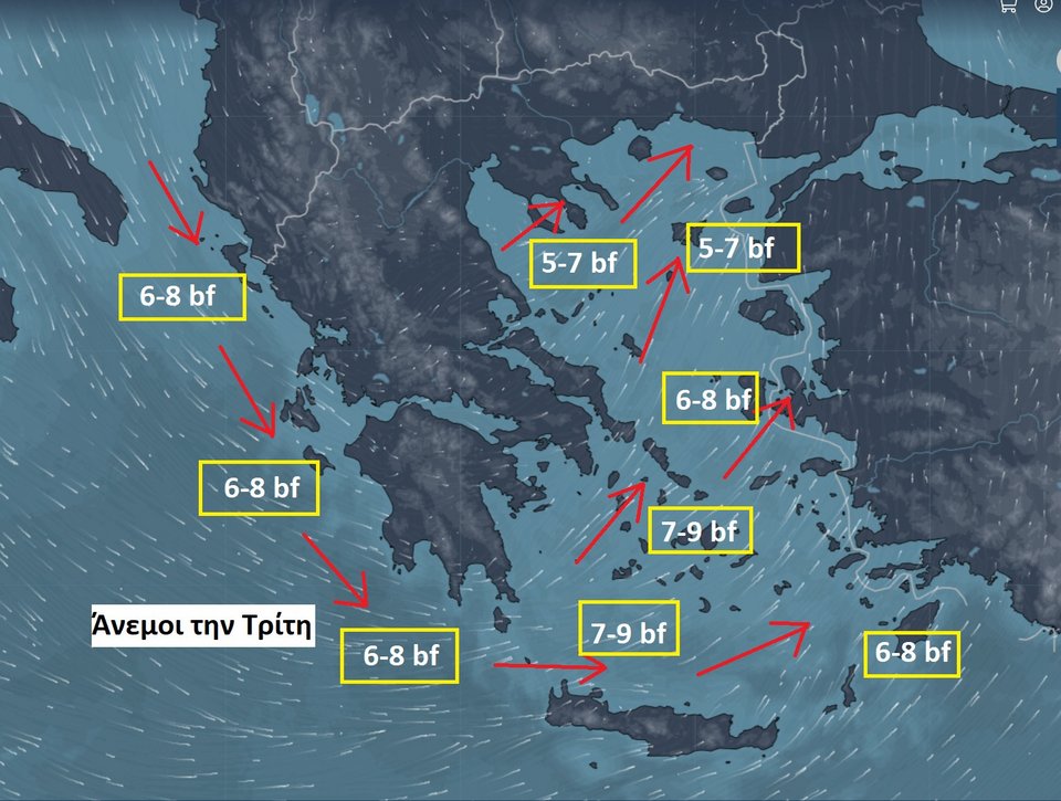 - Κεντρικό & νότιο Αιγαίο : Δυτικοί - Νοτιοδυτικοί 6–8 και τοπικά 9 μποφόρ.